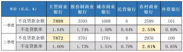 銀監(jiān)會2017年發(fā)布的最新數(shù)據(jù)顯示,2017年二季度末,商業(yè)銀行(法人機(jī)構(gòu),統(tǒng)計口徑)不良貸款余額1.64萬億元,較上季末增加563億元;不良貸款率1.74%,與上季末持平。其中農(nóng)村商業(yè)銀行不良貸款率為2.81%,較上季末增長0.26%。另外,二季度末,全國農(nóng)村信用社不良貸款余額和比例分別為5755億元及4%,不良貸款同比下降0.2%。